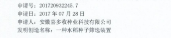 實用新型專利《一種水稻種子篩選裝置》專利申請受理通知書