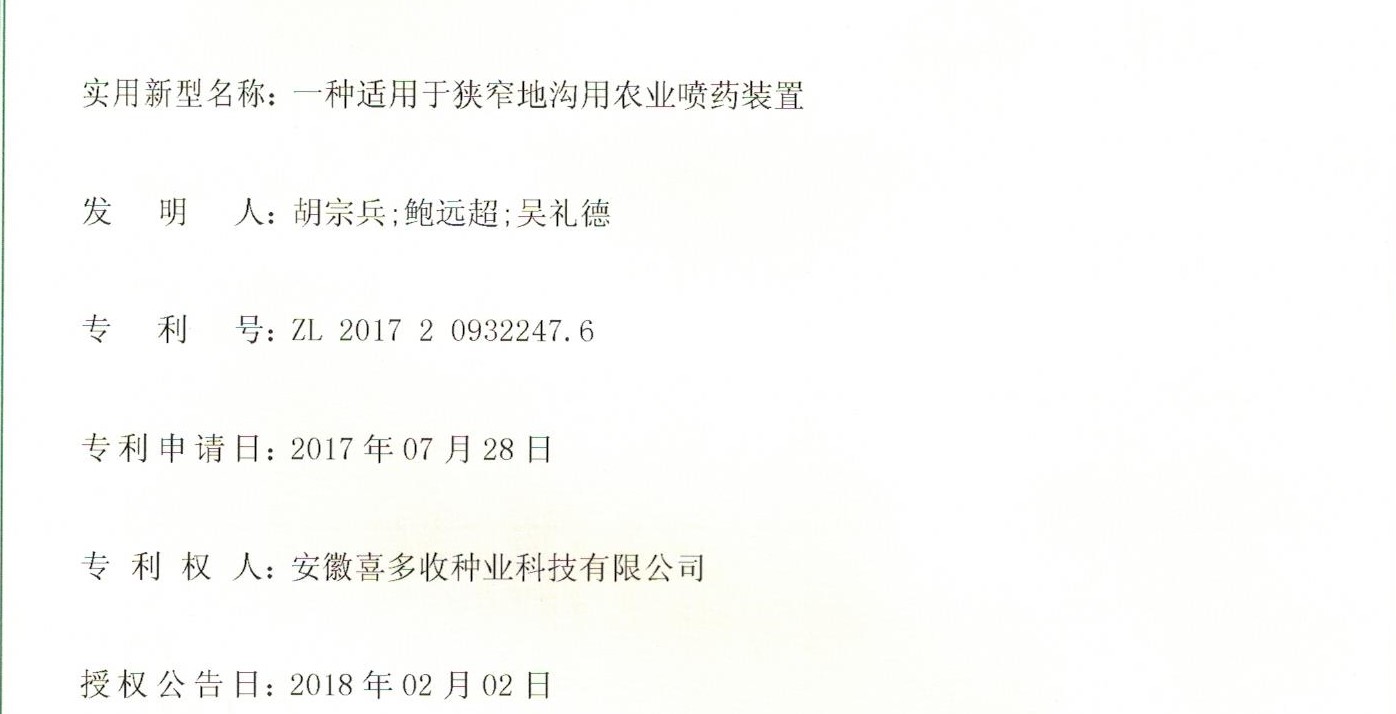 實(shí)用新型專利《一種適用于狹窄地溝用農(nóng)業(yè)噴藥裝置》授權(quán)證書