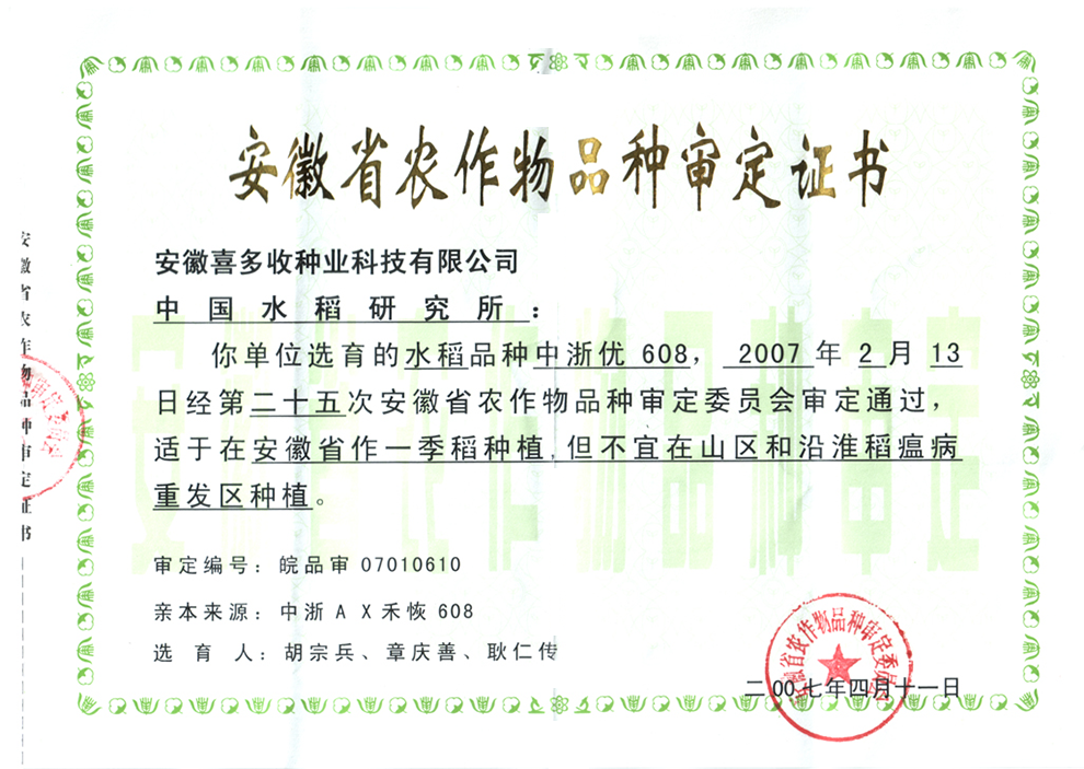 中浙優(yōu)608證書